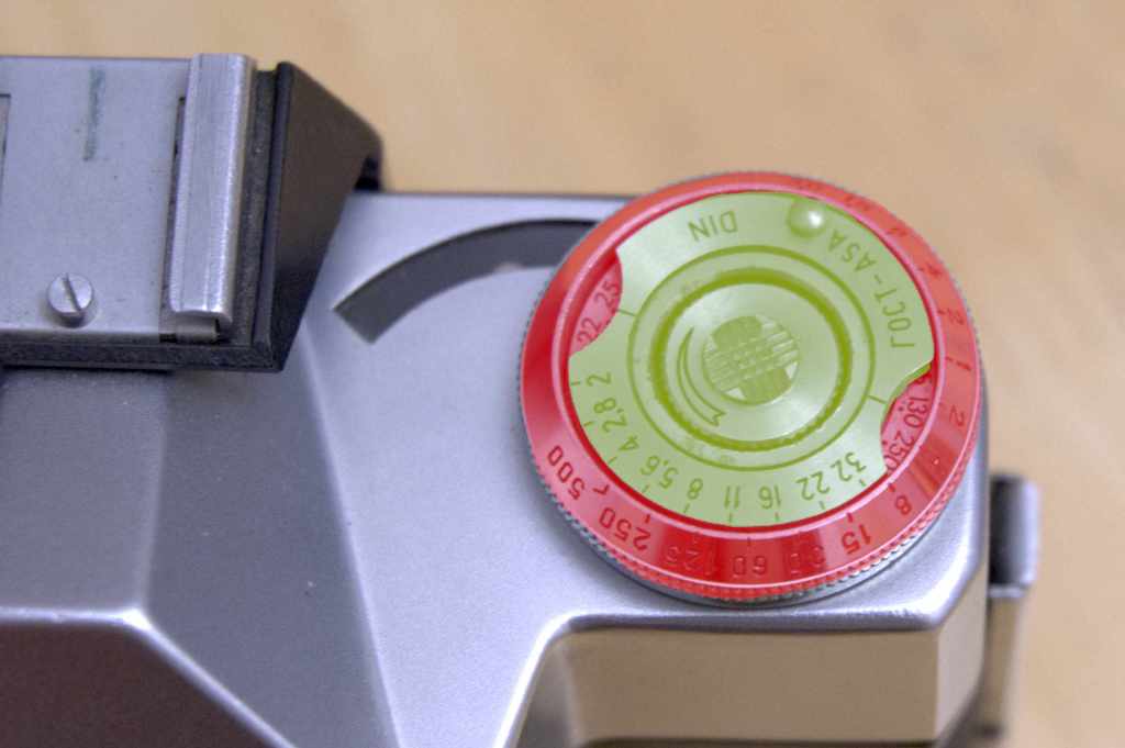 You set the film speed on the top dial, pictured below, by moving the inner part of the dial, highlighted in green, to match the speed of the film.