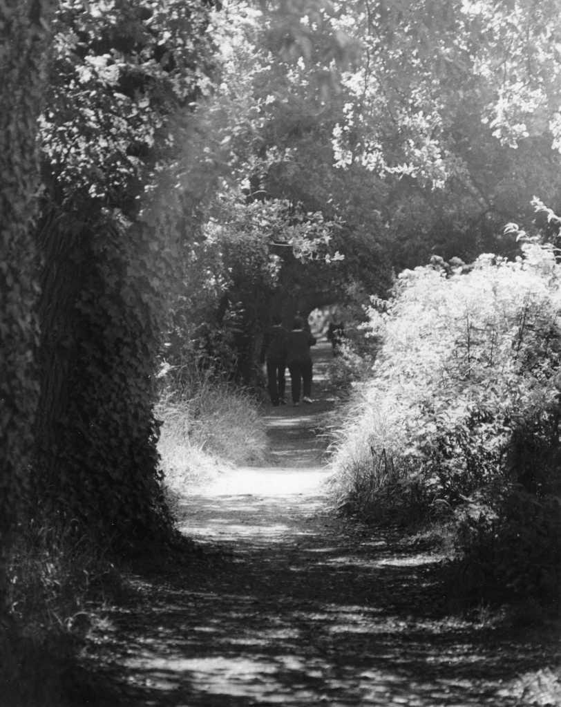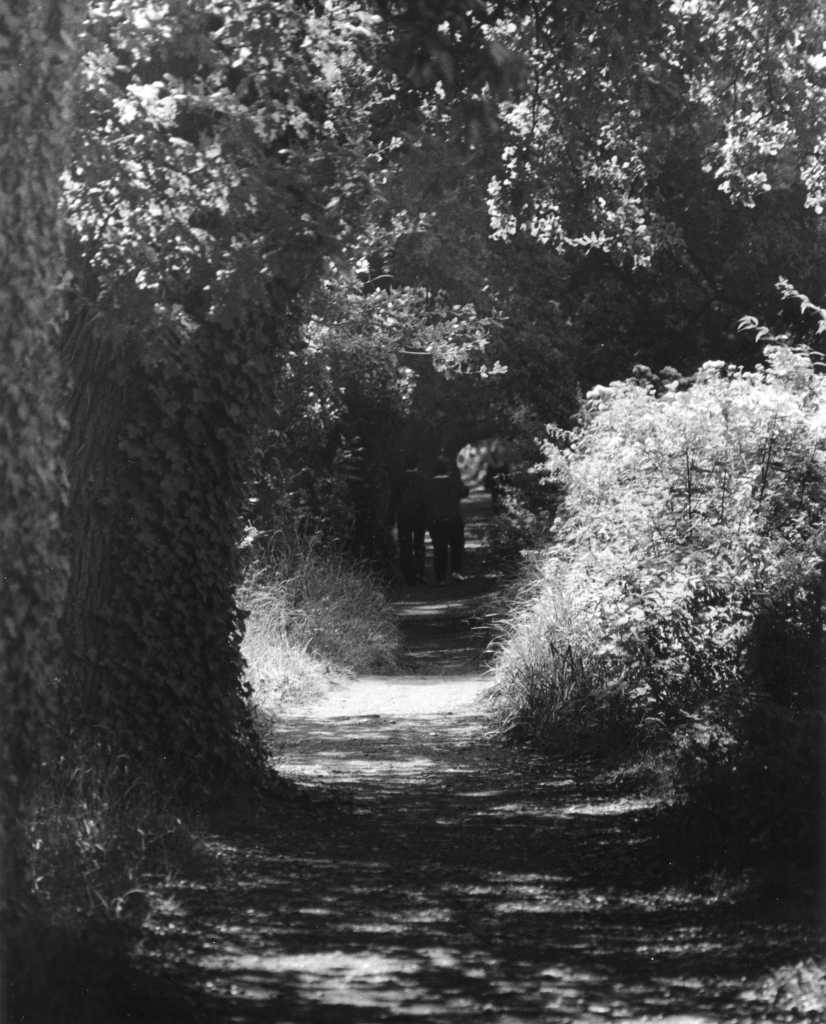 I now have something to work with. I like the brightness of the bush on the right and the path in the middle where the sun is breaking through. My base exposure then is 10 seconds. However I want to lighten or dodge the area that is too dark. Therefore on 8 seconds into the exposure I will try moving my hands over that area, being careful not to touch the paper, and thus it will only receive about 8 seconds of exposure. Or that’s the theory anyway.